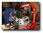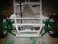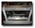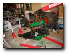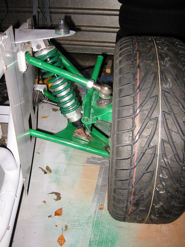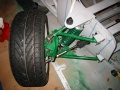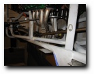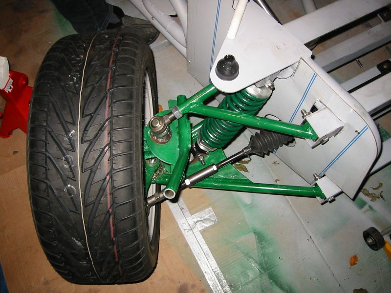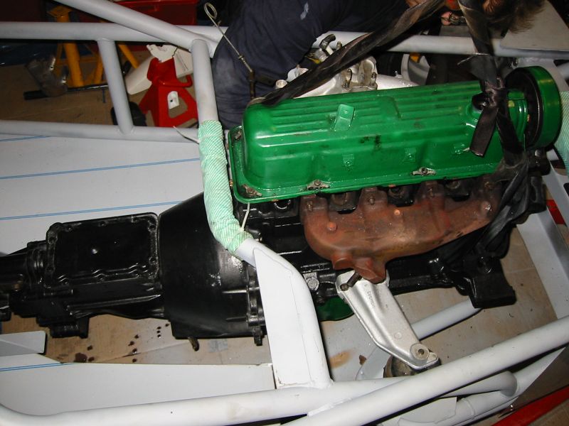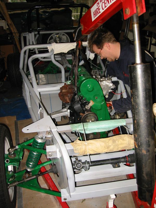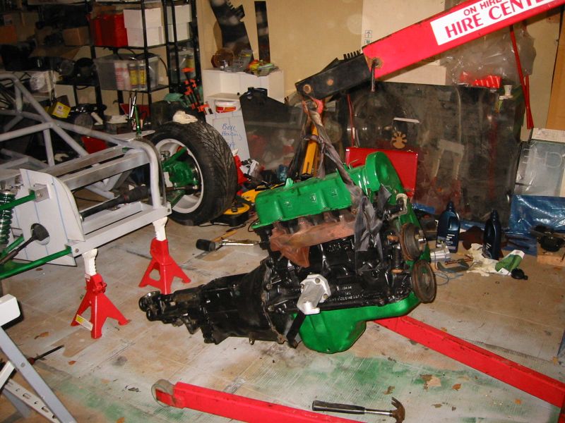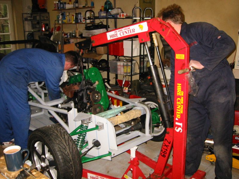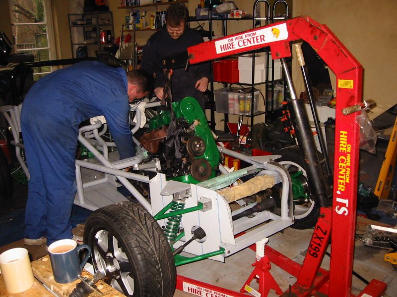 2nd December I haven't really been able to do much since the start of November - I had a small operation which stopped me from lifting. So I spent most of my time planning the order in which I would do things: 1. Wishbone suspension The rest will be planned once these sections have been completed. I'm sure anyone who had bought the sliding pillar front suspension starts putting it together and thinks 'The wishbone looks a lot simpler' - and all those with the wishbone wish they had chosen the sliding pillar. I know this has been said many times about the RH2B but; IT DOESN'T FIT! I realise that comment isn't helpful - but I feel better ;-) The instructions are quite simple and logical, except for the section about why washers are needed. The Video explains that the second fixing for both the upper and lower arms are designed so an angle must be added later so you can change the camber, and will be explained later. Firstly they never explain how, and secondly the arms are fixed within a box section on the leading edge so there is no way the arm's position can be changed afterwards. In my case (and I'm sure it is different for everyone) the wishbone arms didn't fit properly even before I started drilling - where the video said it would be a tight fit it was loose and where the fit should be loose it was tight. I took some time away from the actual fitting of the wishbone to work out the mechanics of the suspension. I decided that the fit would be acceptable for the moment and if necessary I could re-engineer the fittings at a later stage. I continued with the actual fitting, and will worry about tracking and suspension fitting once the majority of the build has been done. 15th December This entry will cover the last two weekends, in which I fitted the handbrake to the tunnel top, fitted the engine and gearbox and finally the rear panel. The handbrake should be fitted to the floor on the passenger side, however a few of the builders have taken advantage of using a different fuel tank allowing the handbrake to be fitted on the tunnel top. Have a look at Steve Loat's and Daz's builds to see where I 'borrowed' the idea;-) I fitted the handbrake using two spacers created from an 8mm tube, and longer bolts - the tubes used were of different lengths to allow the handbrake to sit horizontally on the tunnel top. The engine and gearbox installation was easier than I expected. Jon came over to help and we hired an engine crane from the Hire Center. The instructions given on the video are very comprehensive and the whole process took only about 90 minutes.