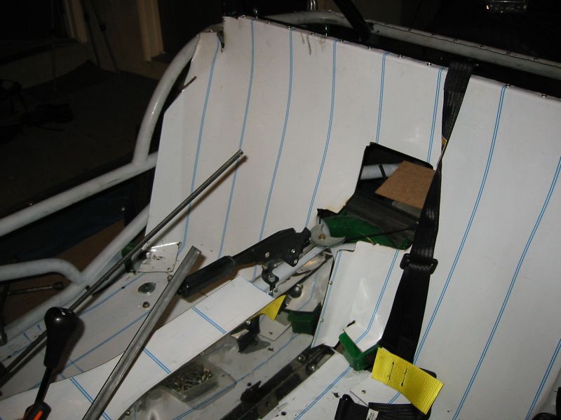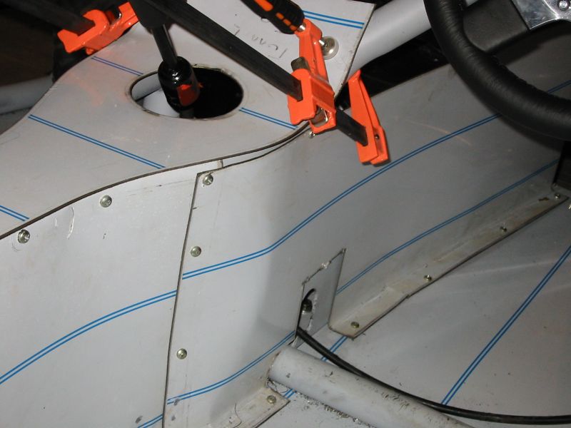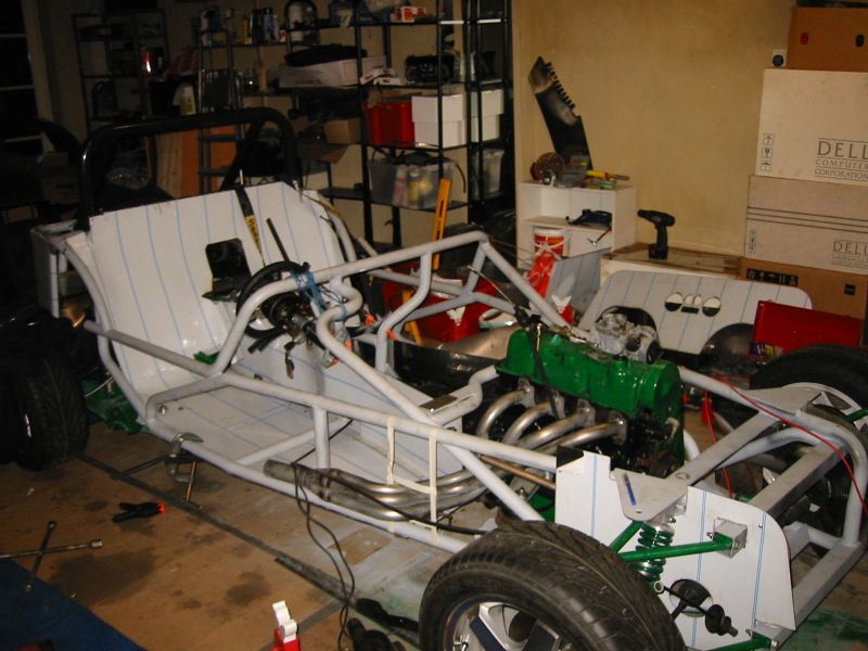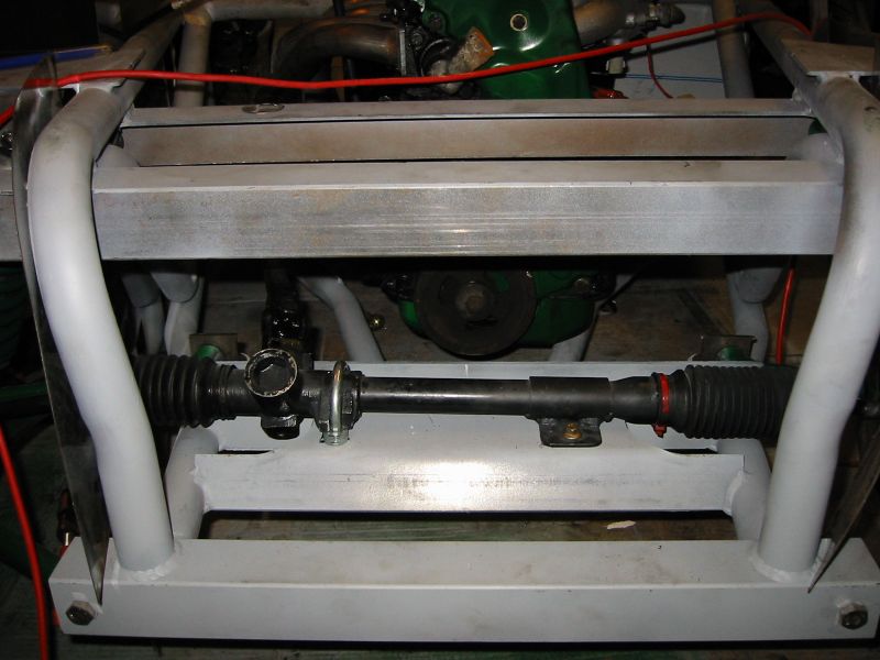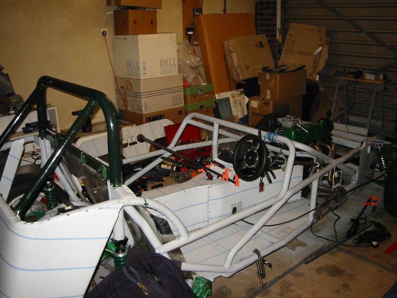 27th December Once the engine had been fitted the rest of the build started to fall into place. I decided to complete the internal panels using self-tapping screws; once the car is almost completed I will then change them for rivets or a more removable fixing (depends if I will need to remove them again). I started with the seat back panel. Following the instructions, the process was quite simple - the video instructions were ok to a point - it advises you to line up the top edge and fix it before moving on to the rest of the panel. This would be ok if the top edge was the correct dimension! The section of the top edge which folds over the central bar wasn't long enough (and offset) on my panel and so when I had bent it and screwed it into place, the side sections which are bent over didn't fit neatly and the pre-cut holes at the base needed resizing. I decided to leave it where it was and recut/bend the panel into the new required shape. The tunnel sides were no problem at all - although watching Trickie bend mild steel in the summer is a whole lot different to bending stainless steel in the winter! The new panels are all pre-cut and simple to fit. I had orginally thought I would run an angled bar between the front and rear seat support bars, but once I had looked at the seat position after the tunnel sides were fitted I could see that would be quite difficult to do - instead I have decided to fit two pieces of angled bracket to the rear seat bar only - in fact the angled bar is part of the rear damper bracket supplied in my kit but not used with the rear coil overs. One this had been done the next stage was to look at how the steering column and pedal would fit. I wanted to check this before fitting the driver's foot panel to make sure I had enough space for the pedals. The first issue I had was that the steering rack (when fitted flush to the chassis) didn't allow the steering column to sit low enough in the car. When the column was in place the universal joint at the rack end jammed. I decided to fit the rack at an angle - I'm not sure if I am happy with using washer spacers - maybe this is a time to call the telephone help line ;-) Anyway with the steering wheel where I wanted it and the pedals roughly in the right place, I found that the supplied upper steering column bracket is far too long. Once New Year is out of the way, I'll fabricate a new bracket and fit the steering column in place. |