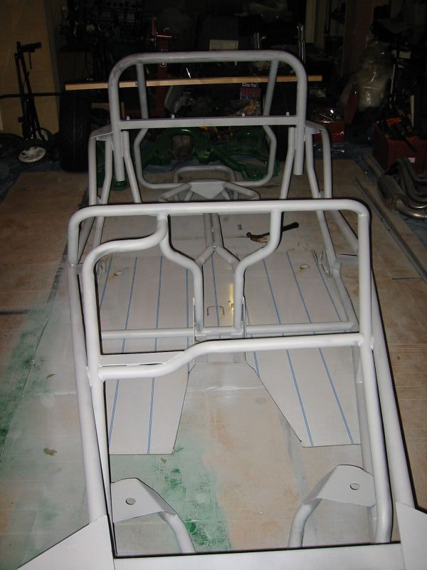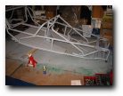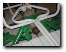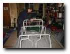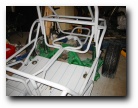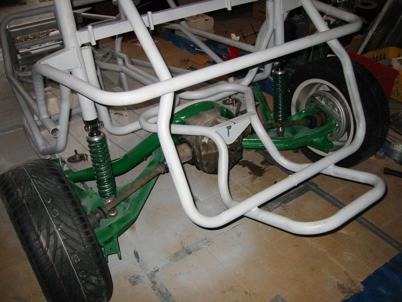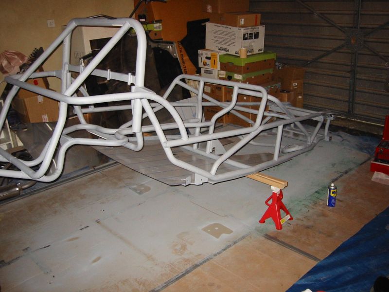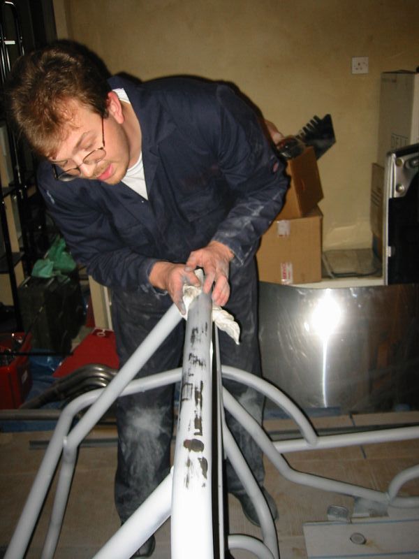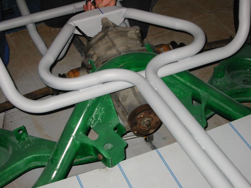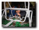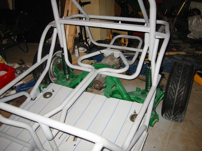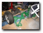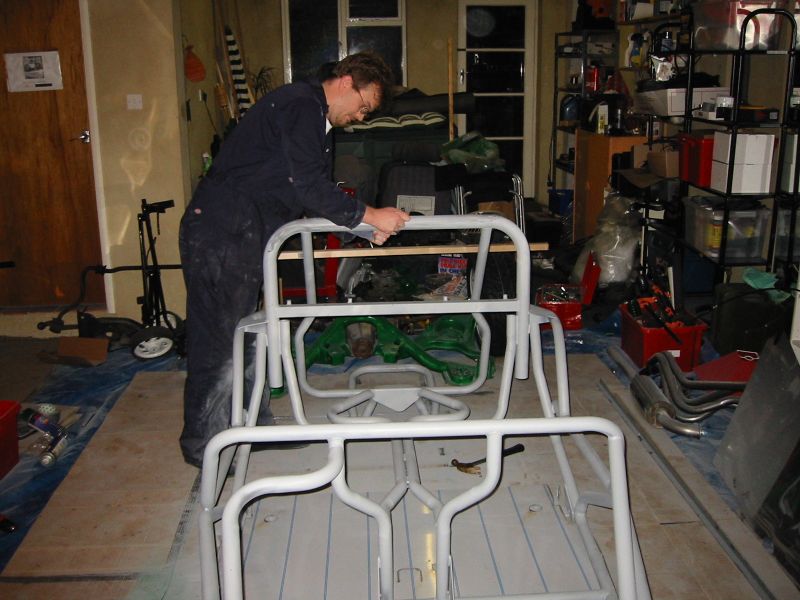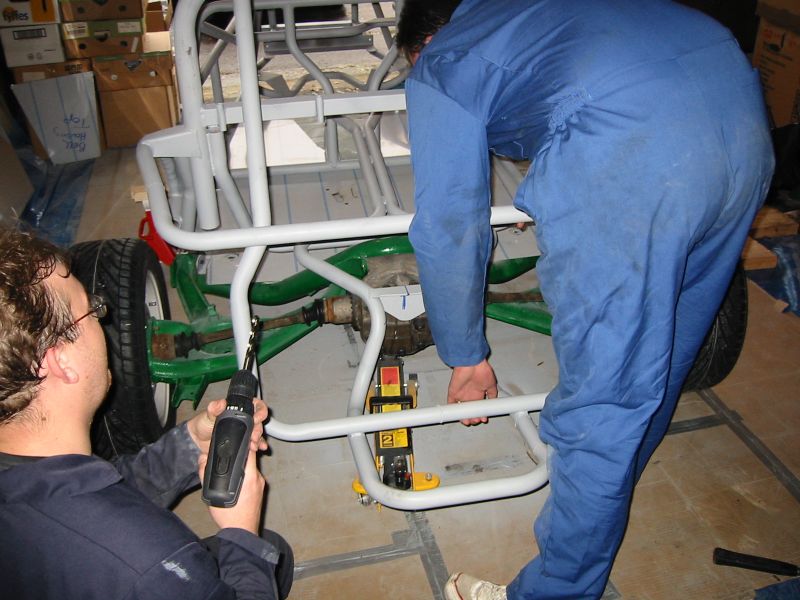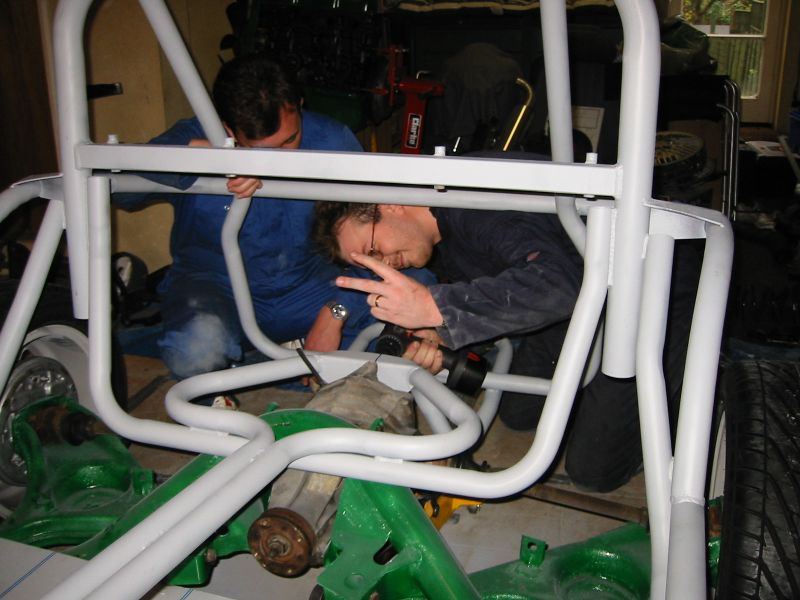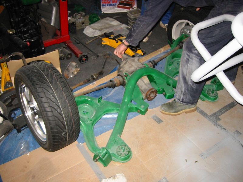 well towards the first major milestone - the rear subframe installation. 2nd November This weekend has been the busiest yet! Jon was helping out at the local beer festival on Friday and Saturay night. On Friday Bernard and I went down to Eastleigh for beer and um well beer actually. Come Saturday morning, we were all feeling surprisingly good (soon fixed by the required section of build video ;-). After a fortifying cup of tea and a bacon sandwich, we started on the rear axle. We presented the rear subframe to the chassis and realised that the subframe needed a slight change to ensure an easy fit - the forging surrounding the outer bushes needed to be ground down to allow the bolts to fit snugly into the holes on the chassis. The bolt into the differential was simple, as was the drilling and bolting of the subframe - although I was happy to have two extra sets of hands!