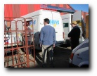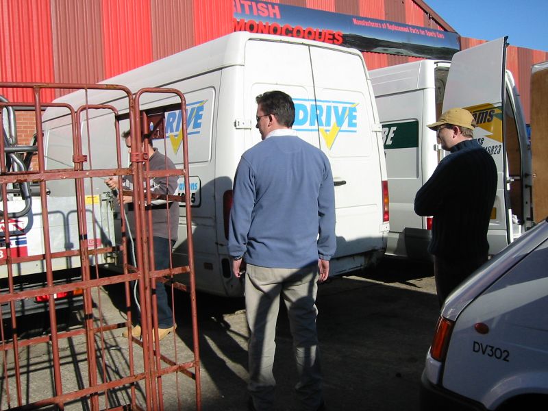 Well that's the idea anyway. Execution Well it wasn't that drastic. Given that everyone who has done the collection said it was an 'experience' I was preparing for one of those 'experiences' that normally leaves someone mentally or physically scarred! Friday and Saturday pretty much went to plan, the Van was collected, we stayed with Rog, and drove to Mansfield in time for 9am - there was a slight digression from this point on.... When we arrived we were sent to the back yard in Grove Street where the initial collections would be made, there was already a queue of vans wiating before us although we were about 4th in line. On the stroke of 9:30 the gates were opened and we were 'organised' into 'tidy' rows. Our turn came and we passed over our hard earned cash, and received two large trolleys full of potential 2B. The dogs are two rotties held in an ivory tower that punctuate every movement and word from a customer with huge amounts of barking and attempts to leap 40 feet to the floor. Jon especially seemed to provoke them into greater heights of activity - although that maybe because he smelled - different ;-) We had some trouble recognising a few items but Tricky was around to help whenever we needed it - although we did get some helpful comments from a neighbourly collector from Devizes who, when asked if he could recognise a part, said "It's a tube" - so that was nice ;-) Once we had completed the packing , we were off home - this took longer than expected due to an accident on our route. Once we had arrived home we had little time to celebrate because we had to get the van back. We unpacked and 'chucked' it all in the garage, stopping only long enough for a few photos. Thoughts on the day